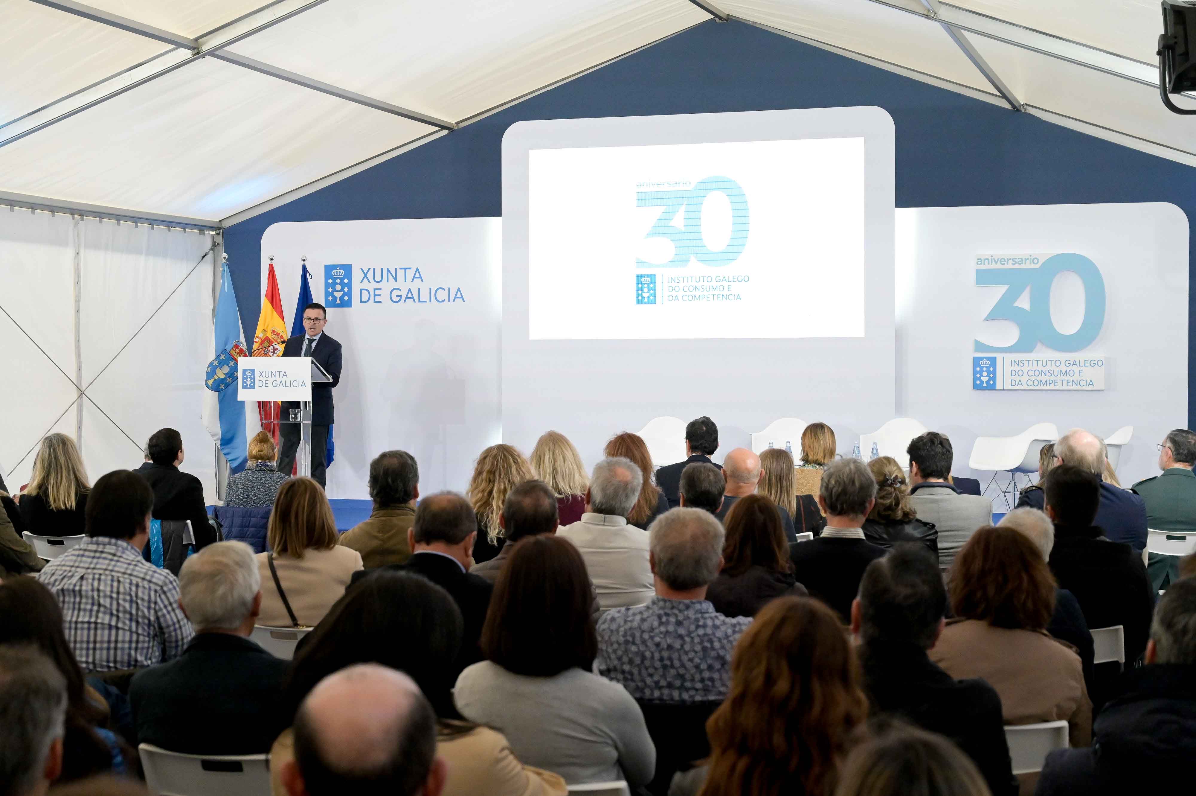 El conselleiro de Emprego, Comercio e Emigración, José González, clausuró hoy el acto con motivo del 30º aniversario del Instituto Galego do Consumo e da Competencia (IGCC), poniendo en valor su labor continua a favor de la simplificación administrativa, de la gratuidad y de la eficacia en la resolución de los conflictos en materia de consumo. En compañía del secretario general técnico de la Consellería, Joaquín Macho, del director general de Comercio y Consumo, Gabriel Alén, y de la gerente del IGCC, Sol Vázquez, el conselleiro aprovechó el acto para destacar especialmente el Laboratorio de Consumo de Galicia, líder estatal tanto en el control como en la comunicación de alertas de productos inseguros con el objeto de blindar los derechos de las personas consumidoras y usuarias y seguir potenciando el comercio local gallego.
